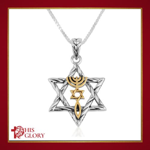 Wear an expression of your faith close to your heart with this designer pendant from the Holy Land of Israel. Crafted from sterling silver, this pendant is shaped as a Star of David with grooves. In its center it displays a gold-plated Messianic Seal, also known as the Grafted In symbol, which consists of a Menorah, a Star of David, and a sign of the fish. The menorah represents the first five books of the Bible, the living word of God. The sign of the fish (Ichthus) is a reminder of Jesus’ promise to the apostles to make them “fishers of men." The point at which these two symbols of faith fused together create a Star of David, an ancient symbol of the Jewish People. This seal depicts one's identity and inheritance as a Believer, and it symbolizes Yeshua's mission to bring the nations together. Will make a meaningful gift for a loved one!